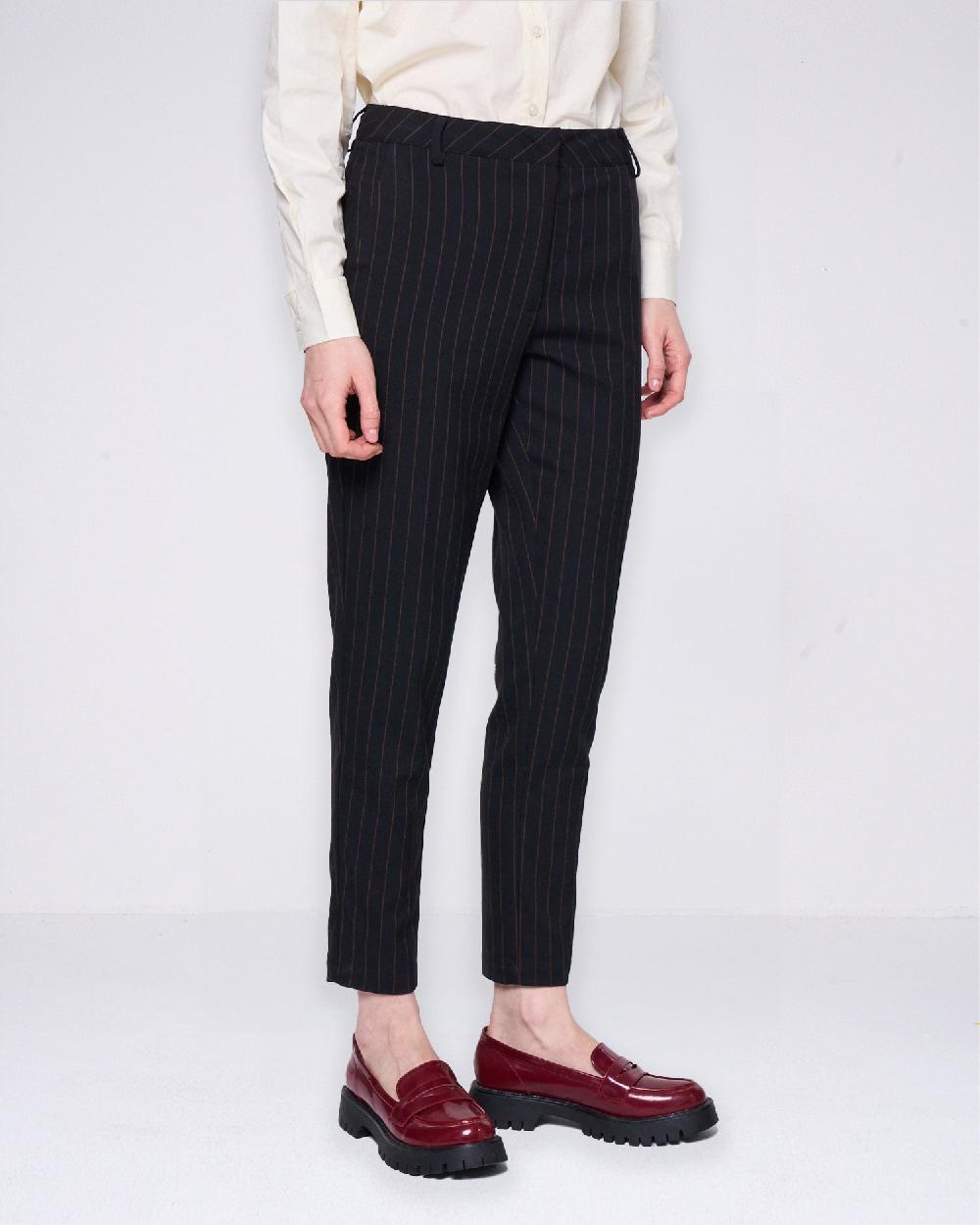 Pantaloni gessati a sigaretta. Cintura in vita con passanti e tasche laterali a filetto.